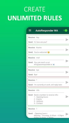 يمكنك إرسال ردود مخصّصة على رسائل WhatsApp التي تتلقّاها باستخدام هذا التطبيق الآلي للمحادثة. تتوفّر لديك العديد من الإعدادات لتخصيص كل رد تلقائي بما يتماشى مع احتياجاتك. قم بتثبيت هذا التطبيق الآن وأبهِر أصدقاءك أو عملاءك ببرنامجك الآلي الخاص!