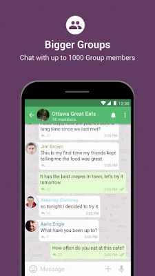 • الدردشة الجماعية: تدعم الدردشة مع الجروبات الأكبر ما يصل إلى 10000 عضو في الجروب الواحد. مع إشعارات المجموعة الذكية والبحث الداخلي لمجموعات الدردشة. شارك مقاطع فيديو, صور وملفات وتحديد الموقع وبيانات الاتصال. واتصل بالمستخدمين الآخرين بسهولة، وانضم إلى جروبات عبر مسح رمز الاستجابة السريعة QR code.