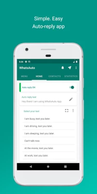 Customise the reply time. You can set WhatsAuto to send auto reply continuously or to send after some time delay or to send only once.