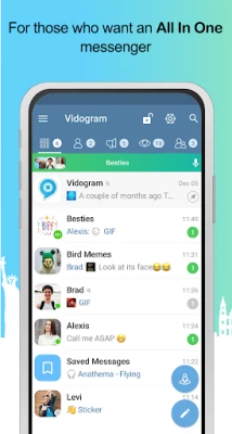 لا يحتوي فيدوجرام فقط على جميع ميزات تيليجرام ، ولكنه يحتوي أيضًا على مجموعة هائلة من الميزات الإضافية المفيدة والفريدة ، التي تم إعدادها لك لتحقيق أقصى استفادة من تجربة المراسلة الخاصة بك.