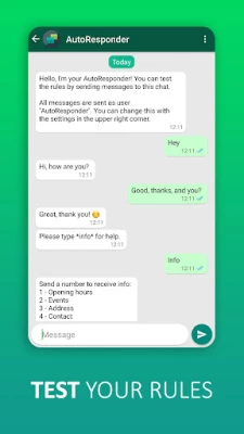 يمكنك إرسال ردود مخصّصة على رسائل WhatsApp التي تتلقّاها باستخدام هذا التطبيق الآلي للمحادثة. تتوفّر لديك العديد من الإعدادات لتخصيص كل رد تلقائي بما يتماشى مع احتياجاتك. قم بتثبيت هذا التطبيق الآن وأبهِر أصدقاءك أو عملاءك ببرنامجك الآلي الخاص!