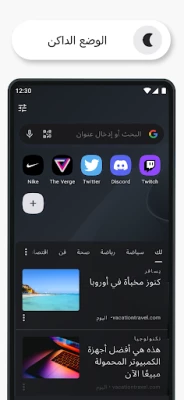 يقدِّم لك الوضع الليلي من Opera خيارات الإضاءة القابلة للتعديل للاستمتاع بتجربة قراءة أكثر راحة في الظلام والشعور بأقل قدر ممكن من إجهاد العين. يمكن الوصول إلى الوضع الليلي بسهولة من القائمة الرئيسية.