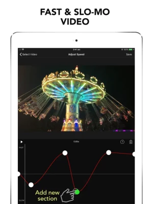 Speed up or slow down sections of video with FREE saving and NO WATERMARK! Supports portrait or landscape operation (on iPad), corrected audio pitch and unrestricted video length.