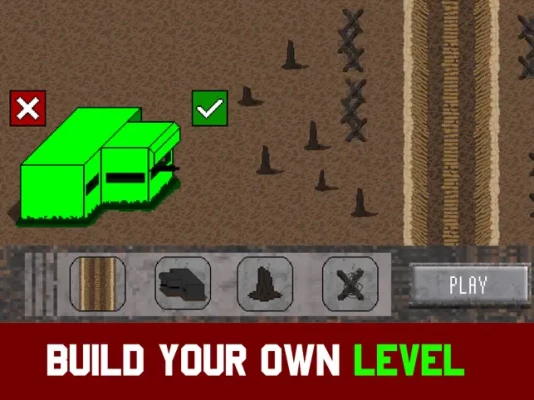 Build your battleground in the creative/sandbox mode according to your own strategy. Place decorations, armor bunkers / army buildings, barbed wire and tanks to sitotamulate a total war against the enemy army!