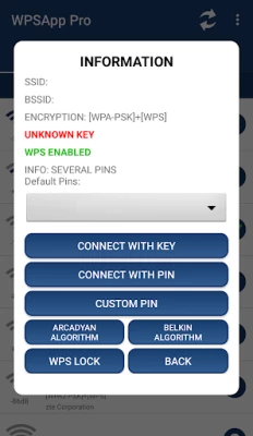 تلك التي تظهر مع علامة استفهام قد مكنت بروتوكول WPS ، لكن الPIN غير معروف ، في هذه الحالة يسمح لك التطبيق باختبار أكثر شيوعًا.